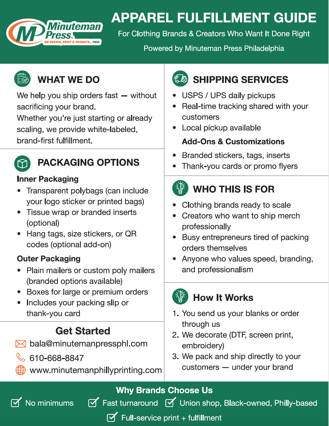 Send your timeline and what you’re trying to fulfill (apparel, kits, print, mail).